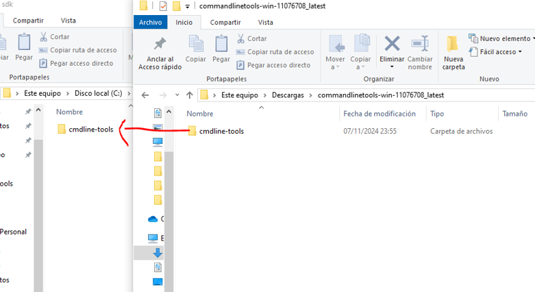 Descomprimimos el archivo descargado, la carpeta cmdlne-tools la ponemos en C:\Android\sdk: