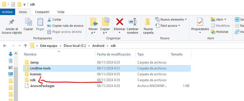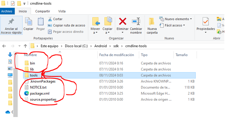 Dentro del directorio C:\Android\sdk\cmdline-tools creamos una carpeta llamada tools y cortamos y pegamos los demás archivos a esta carpeta:
