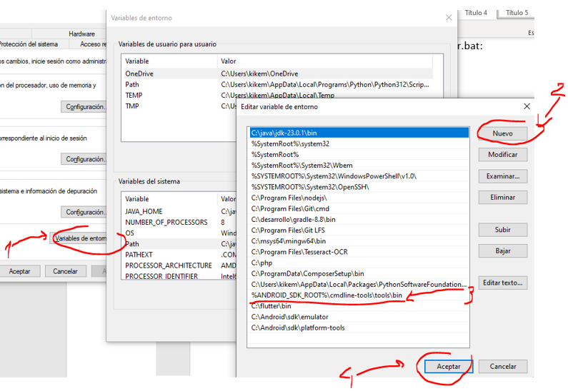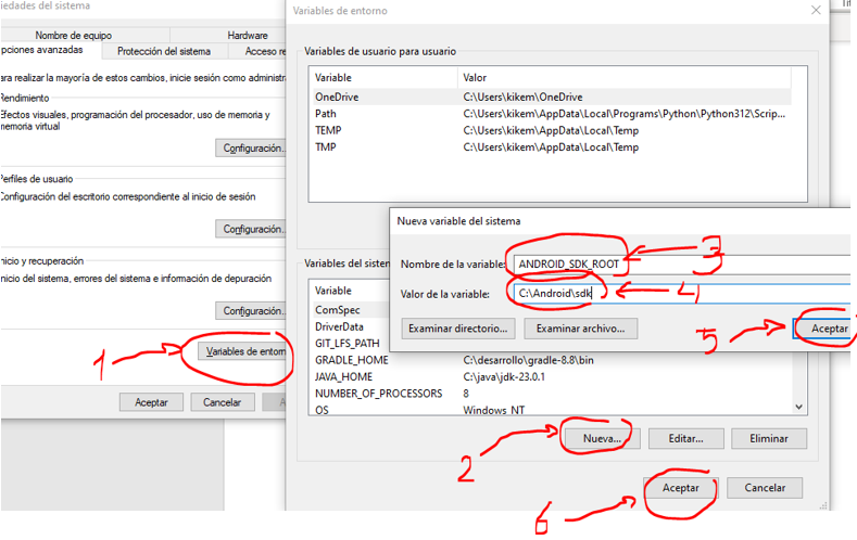 Creando la variable de entorno ANDROID_SDK_ROOT con la ruta C:\Android\sdk\cmdline-tools