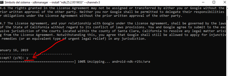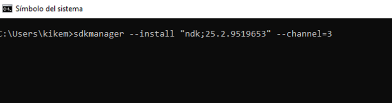 Escribimos: sdkmanager –install «ndk;25.2.9519653» –channel=3