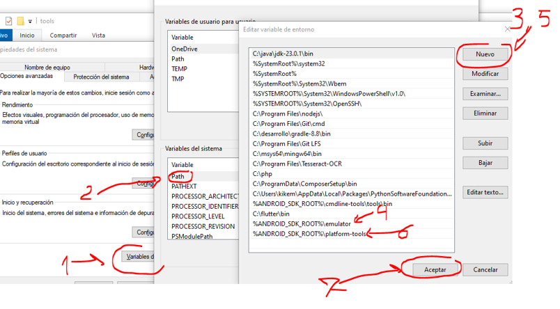 Pero primero tenemos que poner en el path los emuladores (que está en C:\Android\sdk\emulator) y platform-tools (que está en C:\Android\sdk\platform-tools) con los programa emulator, avdmanager y adb:
