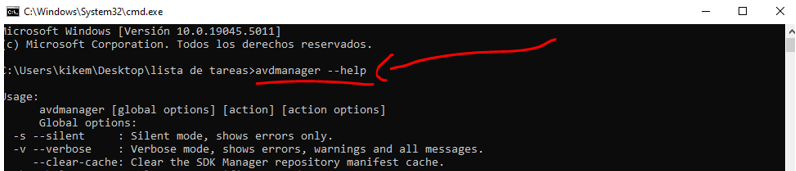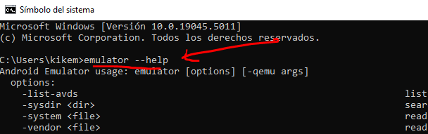 Comprueba que funcionan escribiendo adb –help, avdmanager –help y emulator –help