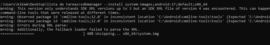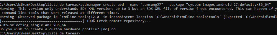 Escribimos avdmanager create avd –name «samsungJ7» –package «system-images;android-27;default;x86_64»: