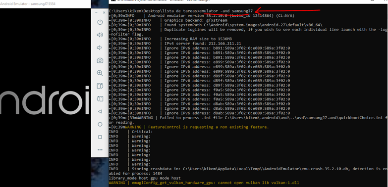 Para abrir mi emulador escribe “emulator -avd samsungJ7”