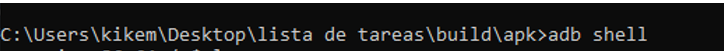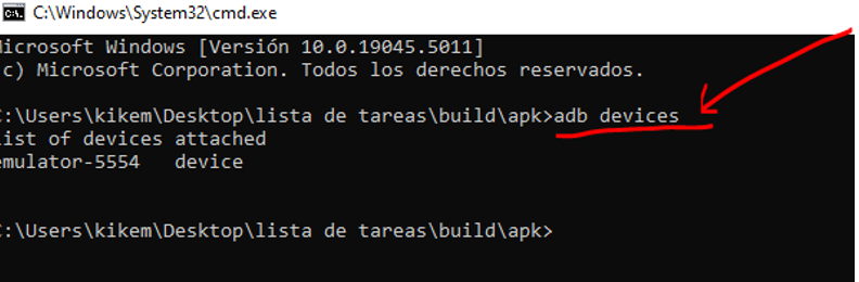 Vamos a la carpeta build que es donde se ha creado nuestro apk y escribimos “adb devices” para ver los dispositivos que hay: