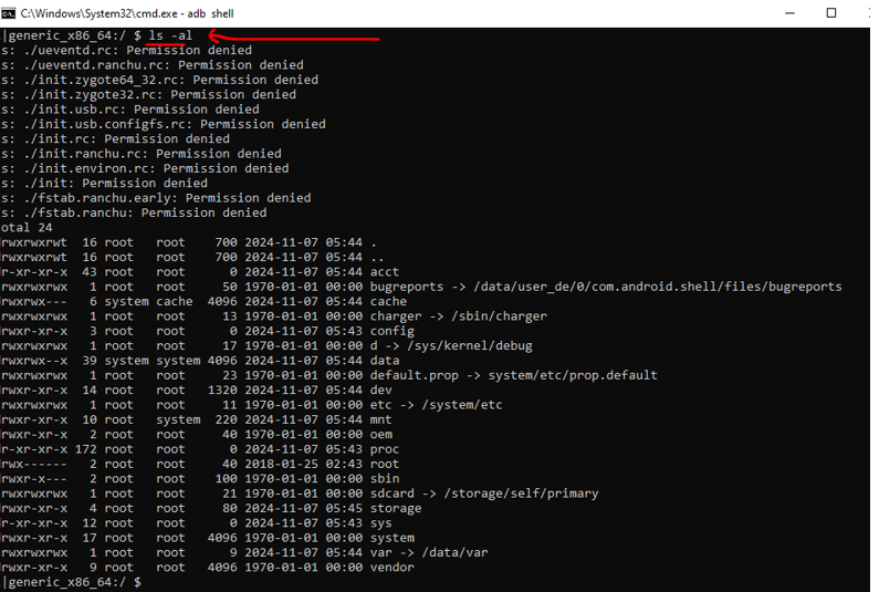 ls -al dentro de la Shell de adb: