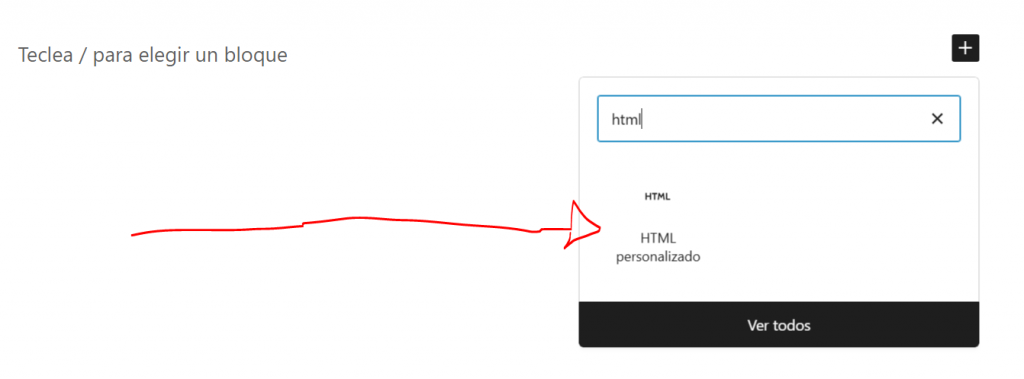 Ahora en donde queramos poner el código, pinchamos en el + del editor de wiorpress y elegimos html personalizado